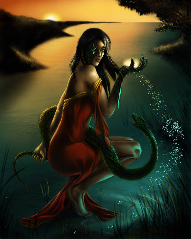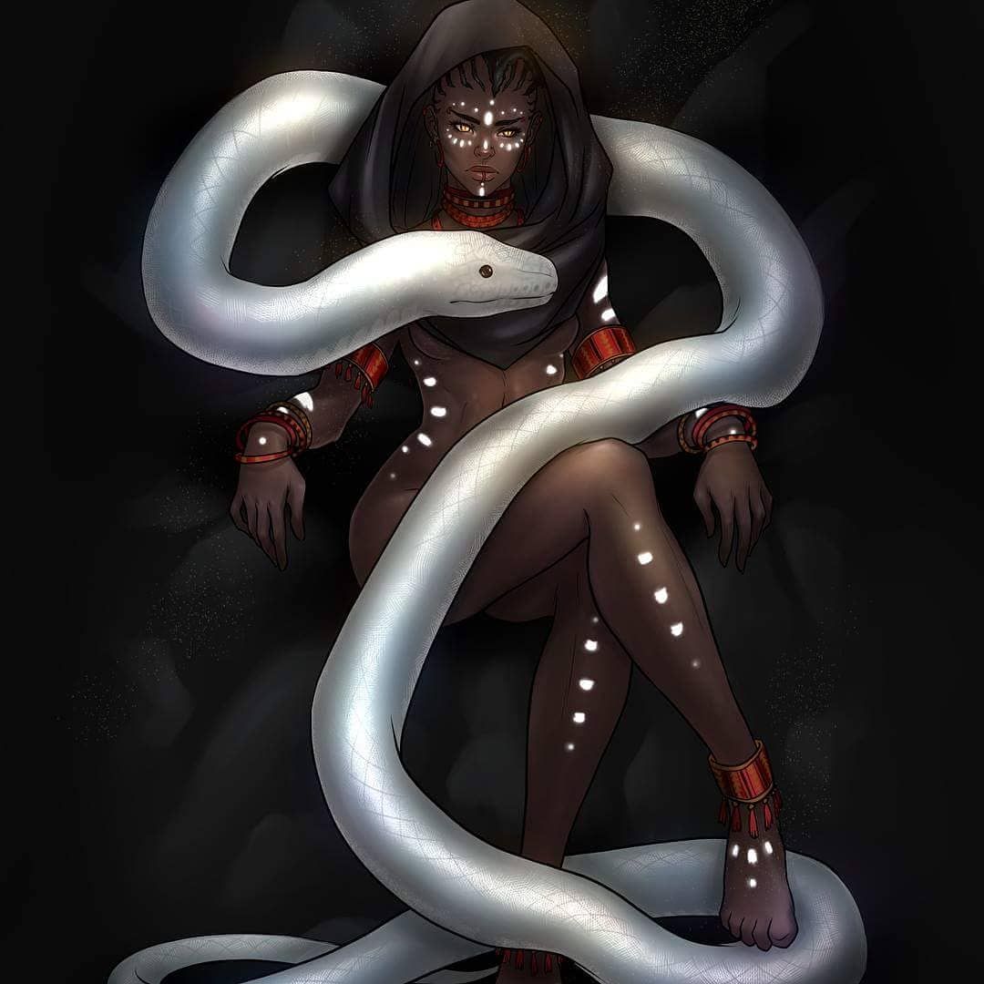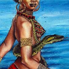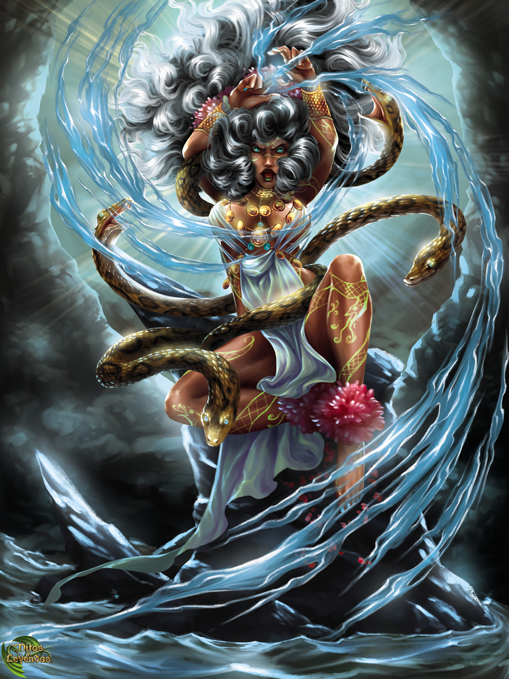 Often thought of as a beautiful snake charmer, protector, and seductive indigenous African water spirit, Mami Wata is widely celebrated to honor the essential and the sacred nature of water. It is also widely believed that She often have depictions that were influences by the lore of ancient European mermaids, Hindu gods and goddesses and Christian saints later in Her history. To add further complexities to Her lore it is said that She can often be a shapeshifter appearing as a Papa Wata from time to time. Mami Wata is a symbol of fertility, healing, protection for women and children, guardianship of sea creatures and a protector of natural environment.