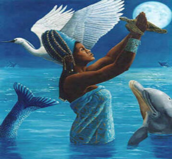 Yemaya is a merciful Goddess who women called upon for aid during childbirth, and the Goddess to whom her people prayed to for fertility, especially by women who have trouble conceiving. According to legend, she birthed 14 of the Yoruban Gods and Goddesses (also referred to as "orishas"). This came about through her being raped by her own son. After this ordeal, Yemaya lay a curse upon him, causing him to die. However, when this happened, the Goddess chose to die as well, and went upon a mountain peak. As she died, the bursting of her uterine waters caused a great flood which, in turn, created the oceans, and from her womb, the 14 orishas were born.